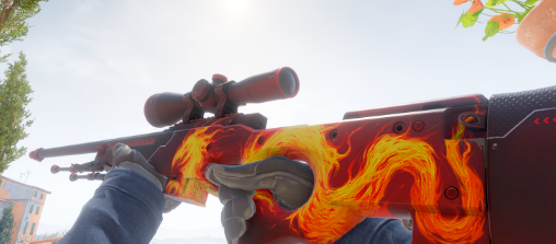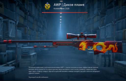 Огненные узоры на корпусе винтовки подчёркивают агрессивный стиль игры. «Дикое пламя» особенно эффектно смотрится с перчатками огненных оттенков.