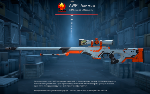 Один из самых культовых и узнаваемых скинов AWP CS2. Яркая бело-оранжевая окраска в футуристическом стиле сразу привлекает внимание. Даже спустя годы «Азимов» остаётся классикой.
