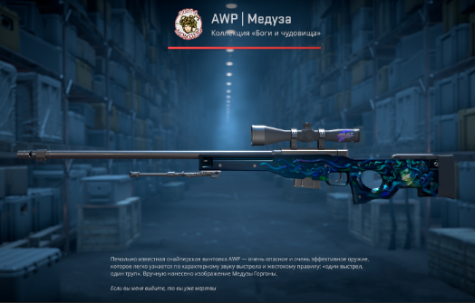 Редчайший и один из самых красивых скинов для AWP. Синий фон и изображение мифической Медузы создают атмосферу тайны и опасности.