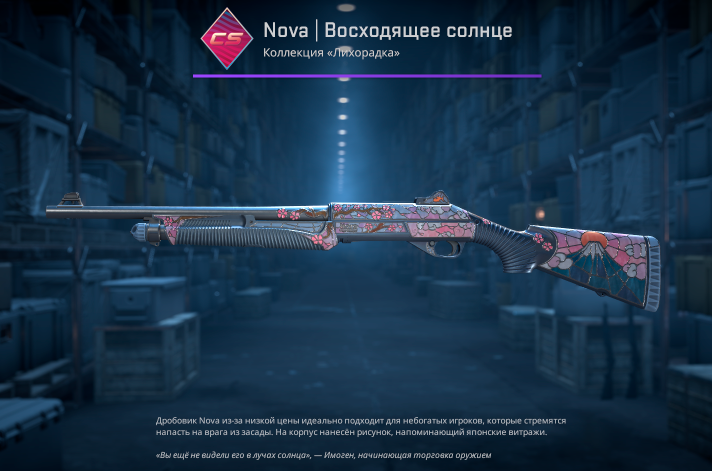 Rising Sun transports you to Japan — golden and orange hues depict the rising sun over Mount Fuji. Even a shotgun can look majestic.