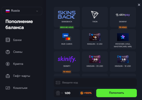 E-wallets: YooMoney, WebMoney, G2A Cards, Kinguin Cards;