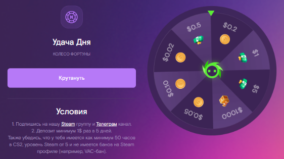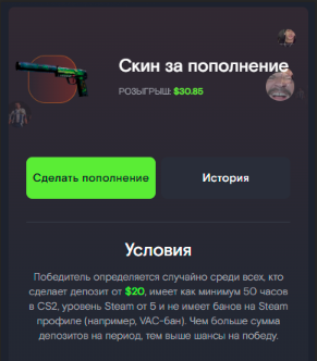 Every day, a giveaway is held among users who deposit $20 or more. The winner receives a valuable skin.