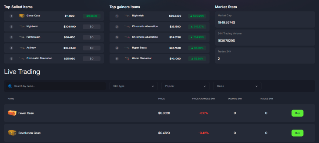 The Trading feature transforms skins into full-fledged digital assets. Users can: